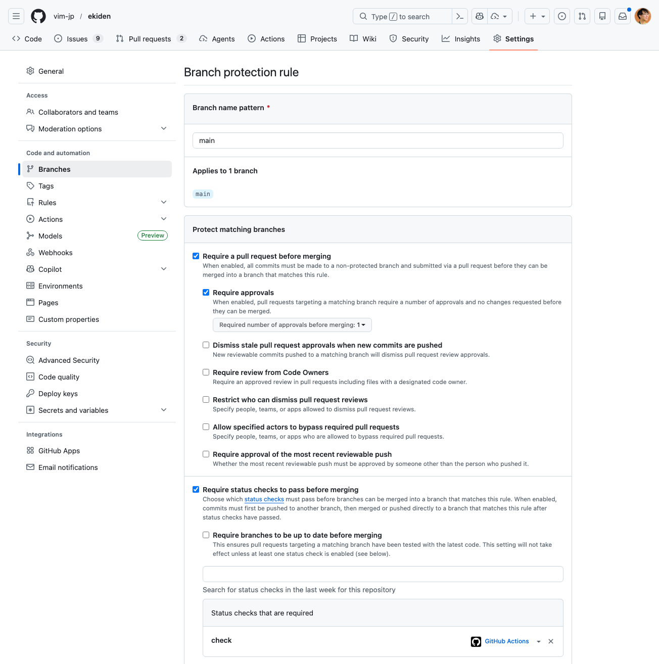対策として @thincaさんがブランチ保護を設定してくれたので、これでCIが失敗しているPRは自動マージできないようになりました。