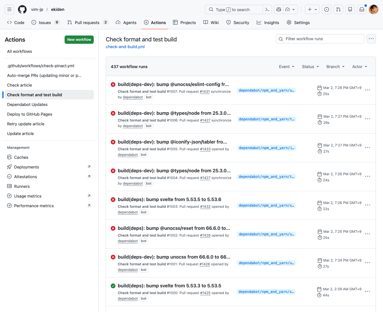 もしやと思いGitHub PagesにデプロイしているGitHub Actionsの履歴を見に行ったところ、実は2026-03-03以降の実行が全て失敗していました…